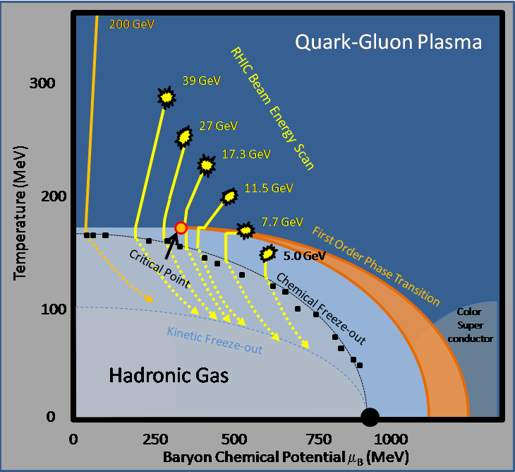 When heavy ions are collided at very high speeds, the matter initially produced is at extremely high temperatures (measured in MeV). As the matter expands and cools, similar to what happened in the first few microseconds after the Big Bang, it follows a trajectory depicted by the different yellow lines in the diagram. Reaction trajectories that are close to the location of the critical point will be modified and it is the signals associated with these modifications that would help physicists determine the location of the critical point.