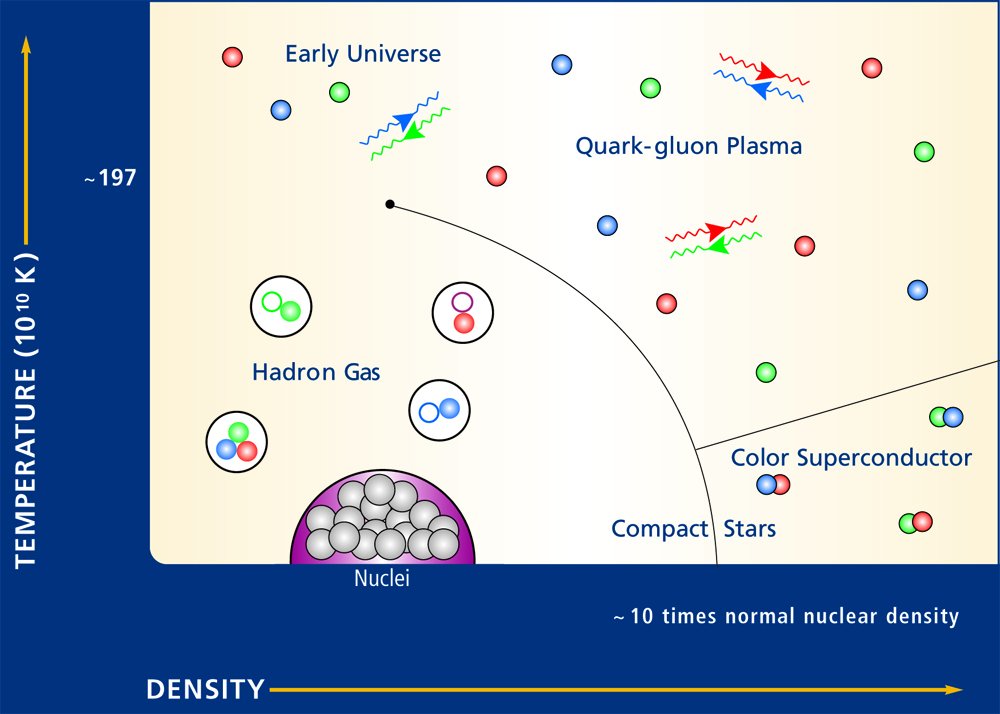 The phase diagram of matter. At very high temperatures amd matter density, ordinary nuclear matter transforms to an exotic type of matter known as a quark-gluon plasma.