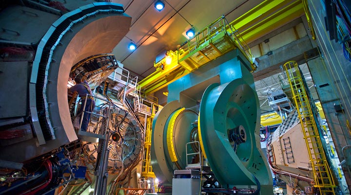 To probe the nuclear phase diagram, we collide heavy ions, such as those of lead and gold, in very large and sophisticated machines known as particle colliders. When these ions are first accelerated close to the speed of light, and then suddenly crashed together, the kinetic energy they carry is transformed into heat thereby melting their nucleus. For that brief moment right after collision, the conditions of temperature and matter density experienced by the colliding particles closely resembles the conditions that existed at the beginning of the Universe or what is commonly known as the Big Bang. Recently, scientists have been able to show that in the first few microseconds after collision (which mirrors the first few microseconds of the birth of the Universe), a very short-lived phase of matter consisting of unbound quarks and gluons, the very building blocks of nuclear matter, is formed. This phase of matter is known as a quark-gluon plasma or QGP. Eventually, as the matter expands and cools down, it coalesces to form new particles that are then measured by particle detectors such as the PHENIX detector pictured below.